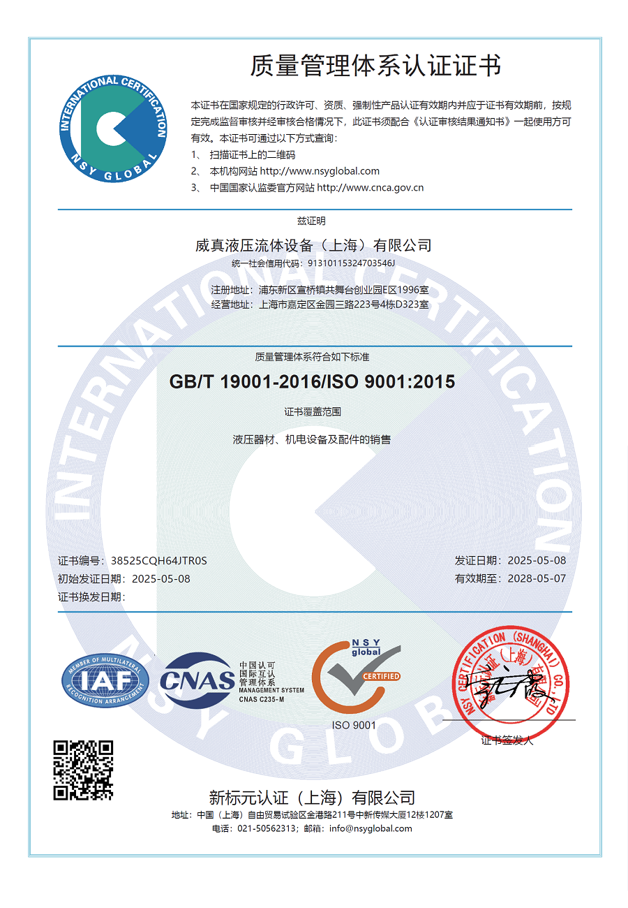 • 威真液壓已完成ISO9001質量體認證
